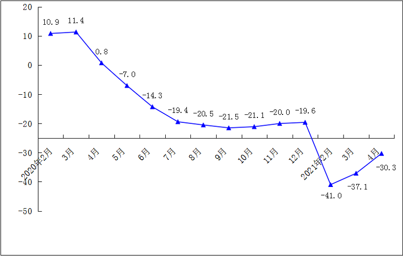 2021年1-4月规模以上工业万元产值能耗累计增速(%)
