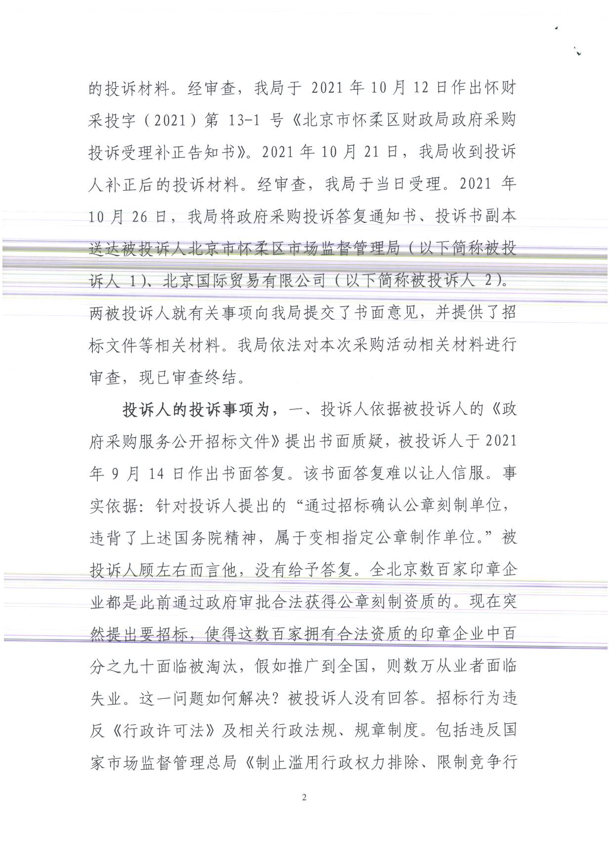 怀柔区财政局关于政府采购投诉处理决定书(2021)第13-4号