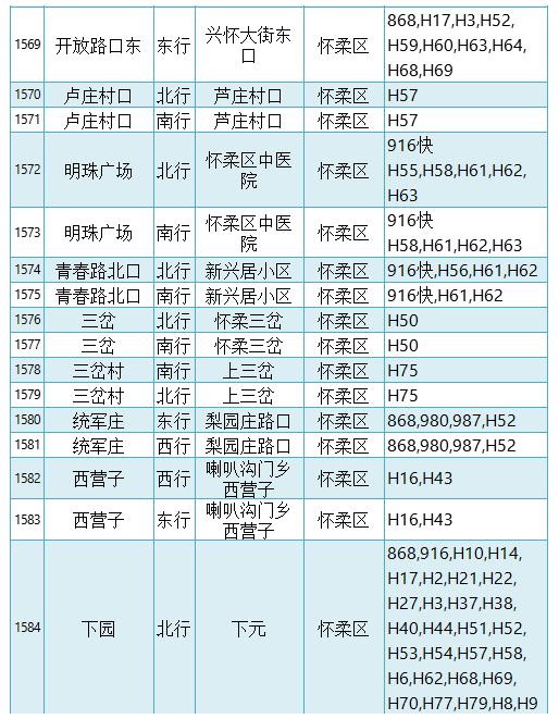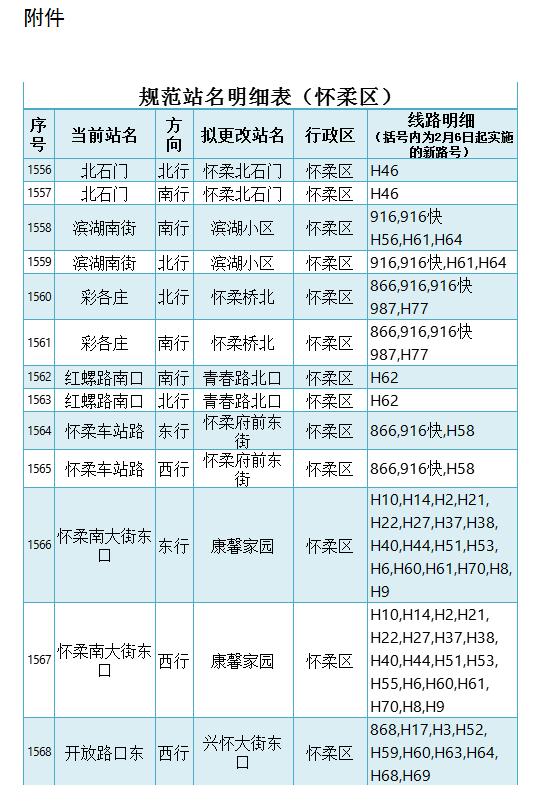 目前,公交站点名称一般以怀柔区道路名称、著名景点或小区名称进行命名。随着我区的发展,部分公交站名出现了与实际情况不符的现象。本次重点针对因外部实体发生变化,导致站名与实体不符的、由于道路改扩建以及交通组织变更迁移站位,同名站位距离已超过一个站距的、站名中含有不同区域同名实体等情况进行调整。例如“明珠广场”,拟调整为“怀柔中医院”、位于怀柔区的“北石门”调整为“怀柔北石门”,在站名前增加区域名称便于区分。