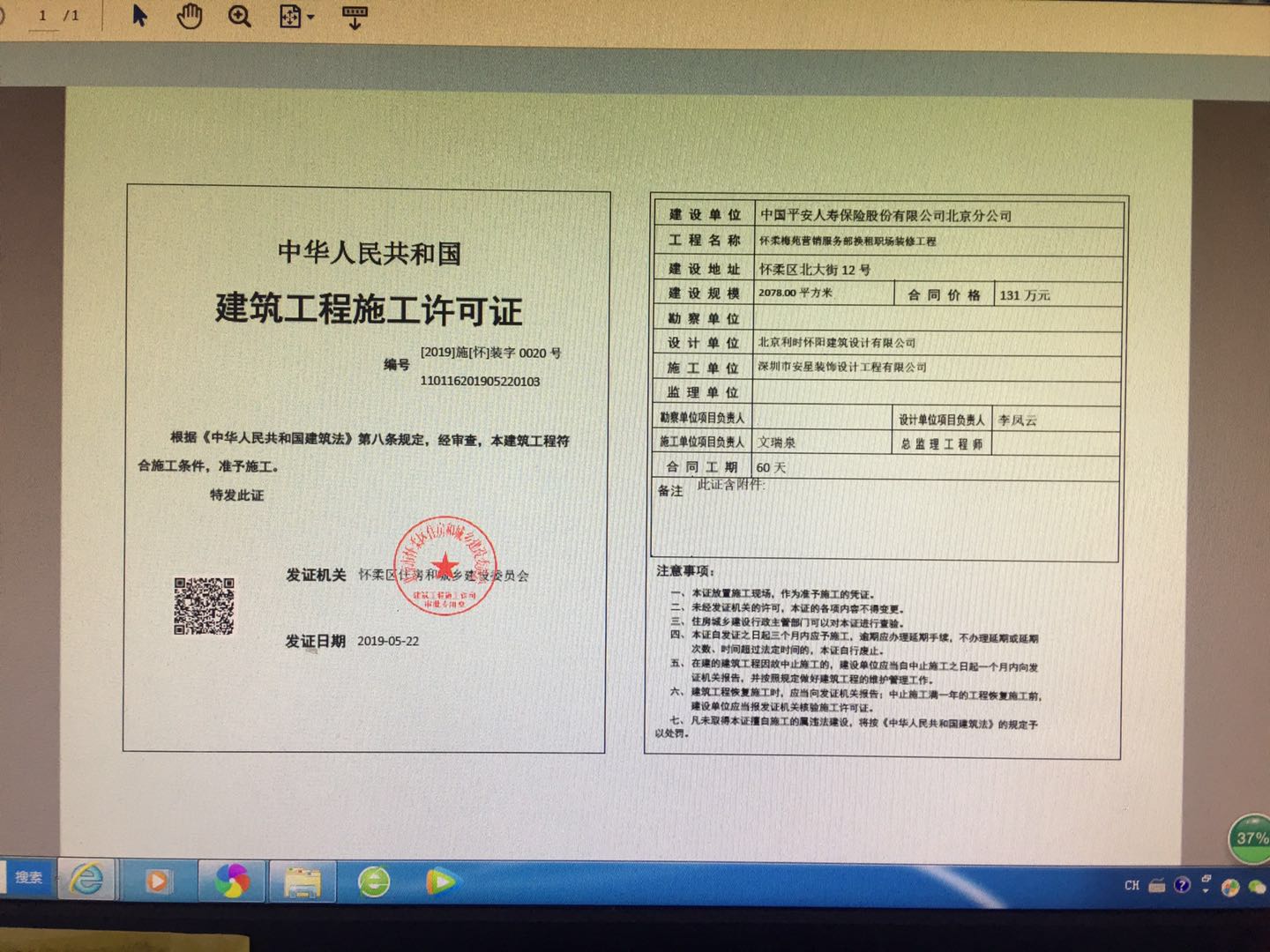 施工许可证——怀柔梅苑营销服务部换租职场装修工程